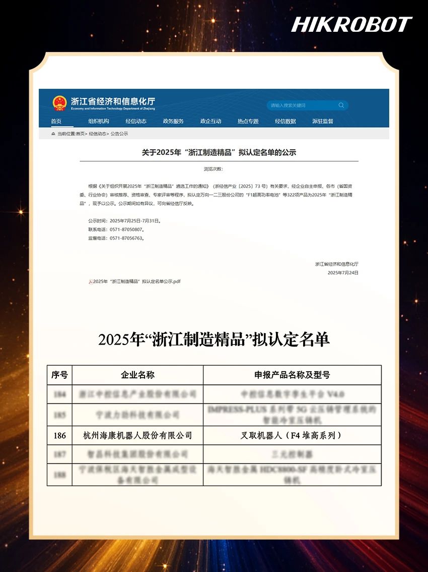 近日,浙江省經濟和信息化廳發布《關于2025年“浙江制造精品”擬認定名單的公示》,海康機器人“叉取機器人(F4堆高系列)”憑借卓越的技術創新能力和產品性能成功入選。