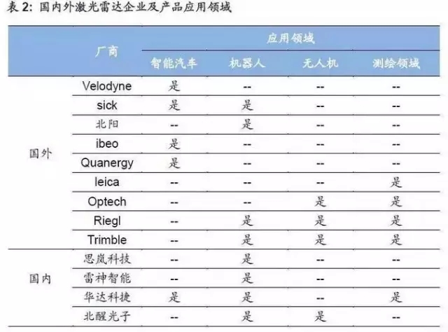 激光雷達的下游應用領域核心是無人駕駛汽車、服務機器人、無人機和工業測繪領域等。從目前全球激光雷達企業的下游應用領域分布來看,居多的仍然是智能汽車和機器人領域,傳統的測繪領域中,也有一批3D激光掃描儀的企業,轉型向更具成長性的機器人和無人駕駛領域。